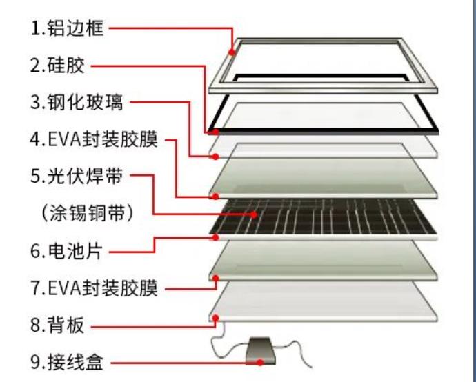 雖然光伏發(fā)電系統(tǒng)的組成材料各異,但所有的組件都包括若干層從向光面到背光面的材料。太陽光首先穿過保護層(通常為玻璃),然后通過透明接觸層進入到電池內(nèi)部。