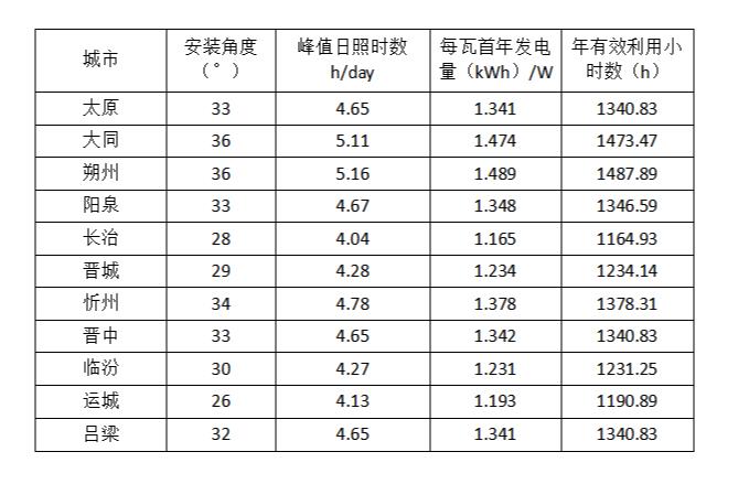 山西省光伏電站的最佳安裝傾角、發(fā)電量、年利用小時(shí)數(shù)的參考值是多少?