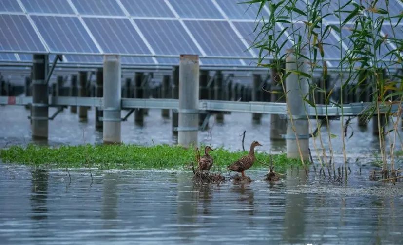 中廣核安徽當涂太白260MW漁光互補光伏電站,板上光伏發(fā)電,板下廣闊的水面用于養(yǎng)殖魚蝦、種植水產(chǎn)農(nóng)作物。
