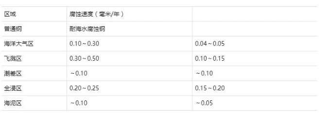 通過在實(shí)際海洋環(huán)境條件下的鋼樁試驗(yàn),表明腐蝕最嚴(yán)重的部位發(fā)生在飛濺區(qū),在平均高潮線的上部。海洋石油平臺(tái)不同部位的腐蝕速度如下表所示。