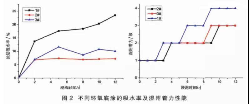 環(huán)氧樹脂所制的底涂吸水率小、濕附著力性能強(qiáng)以及防腐蝕效果最好。