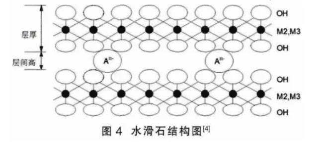 個羥基構(gòu)成的八面體結(jié)構(gòu),結(jié)構(gòu)中部分M2+被M3+同晶取代而使層板帶正電荷, 層間充填的陰離子起平衡電荷作用,經(jīng)典結(jié)構(gòu)如圖所示:
