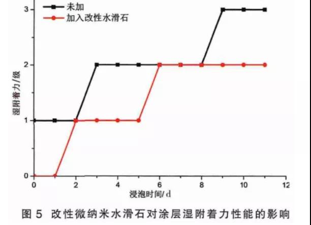 可以看出,加入改性水滑石后的涂層濕附著力性能明顯優(yōu)于未改性的。這是由于改性微納米水滑石加入到體系后,聚合反應(yīng)將聚合物長鏈接枝到顆粒的表面,使填料同樹脂界面實現(xiàn)化學(xué)鍵合。水滑石的層柱狀雙金屬氫氧化物結(jié)構(gòu), 使得鍵合能力增強(qiáng),交聯(lián)密度顯著增加,因此濕附著力得到提高。