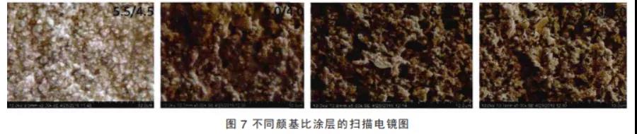 為了探究底漆適宜的顏基比,制備了顏基比分別為5.5∶4.5、6.0∶4.0、6.5∶3.5、7.0∶3.0 的環(huán)氧防腐底漆,其濕附著力及SEM 測試結(jié)果如圖所示。