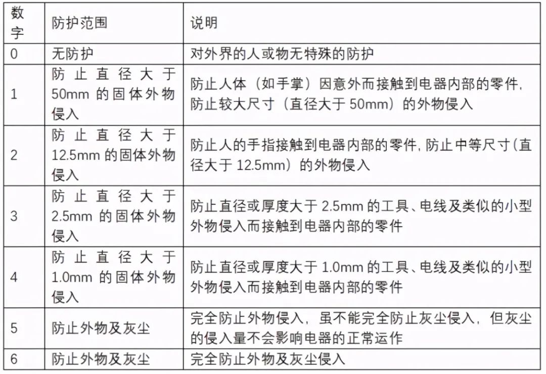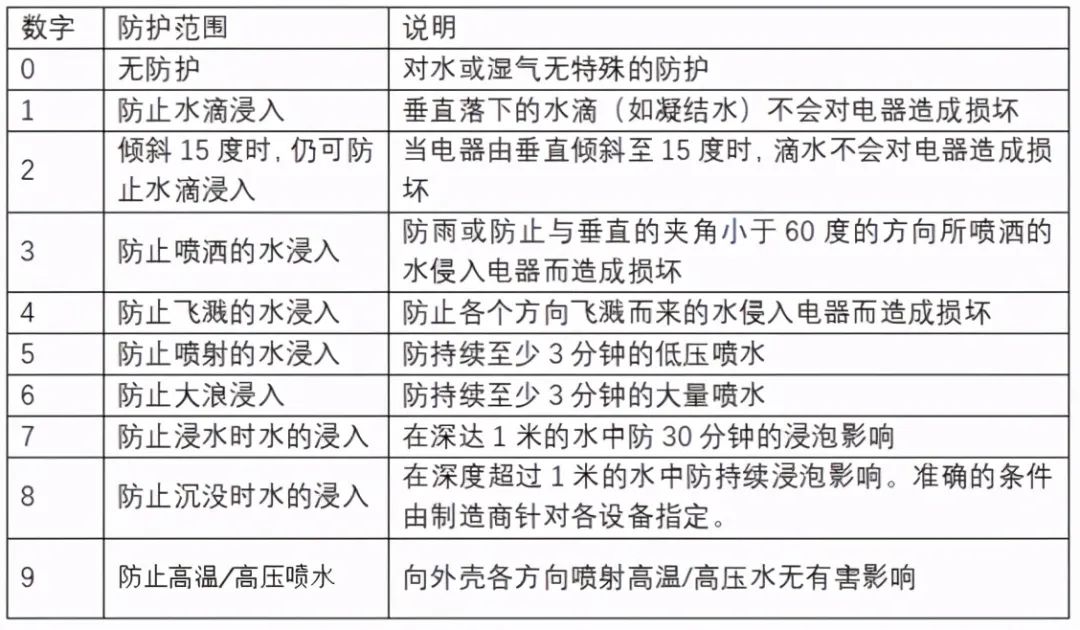 第一位數(shù)字表示防塵等級、防止外物侵入的等級(外物指含工具,人的手指等均不可接觸到電器之內(nèi)帶電部分),由0-6劃分為7個等級;第二位數(shù)字表明設(shè)備防水的程度。代表防止進(jìn)水的等級,最高級別是9。